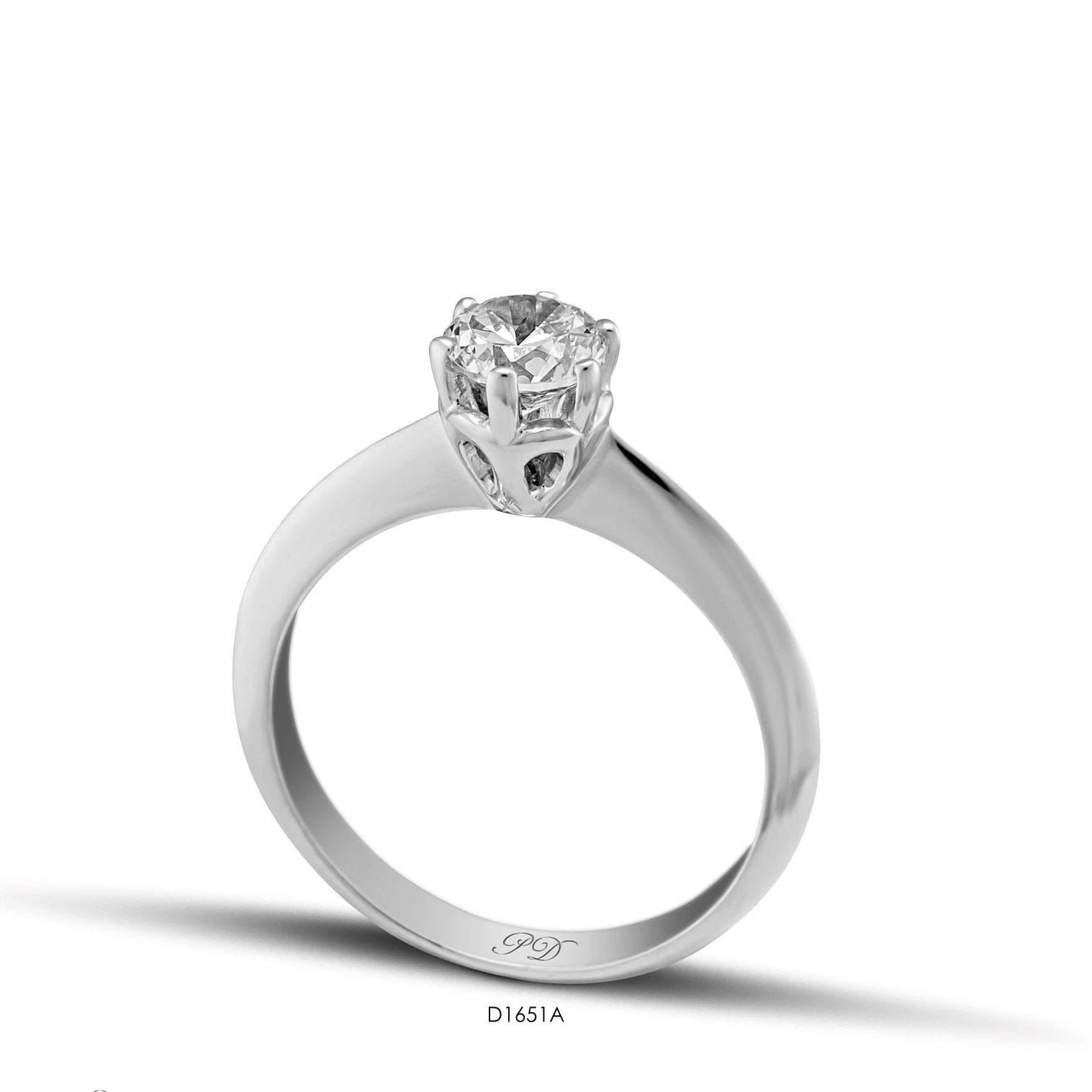 Κλασικό μονόπετρο δαχτυλίδι με στρογγυλό διαμάντι σε κοπή μπριγιάν. Έχει έξι επικλινή δόντια τα οποία ακολουθούν το σχήμα του διαμαντιού προκειμένου να αναδείξουν όλη του την ομορφιά. Μια διαχρονική επιλογή κομψότητας!
