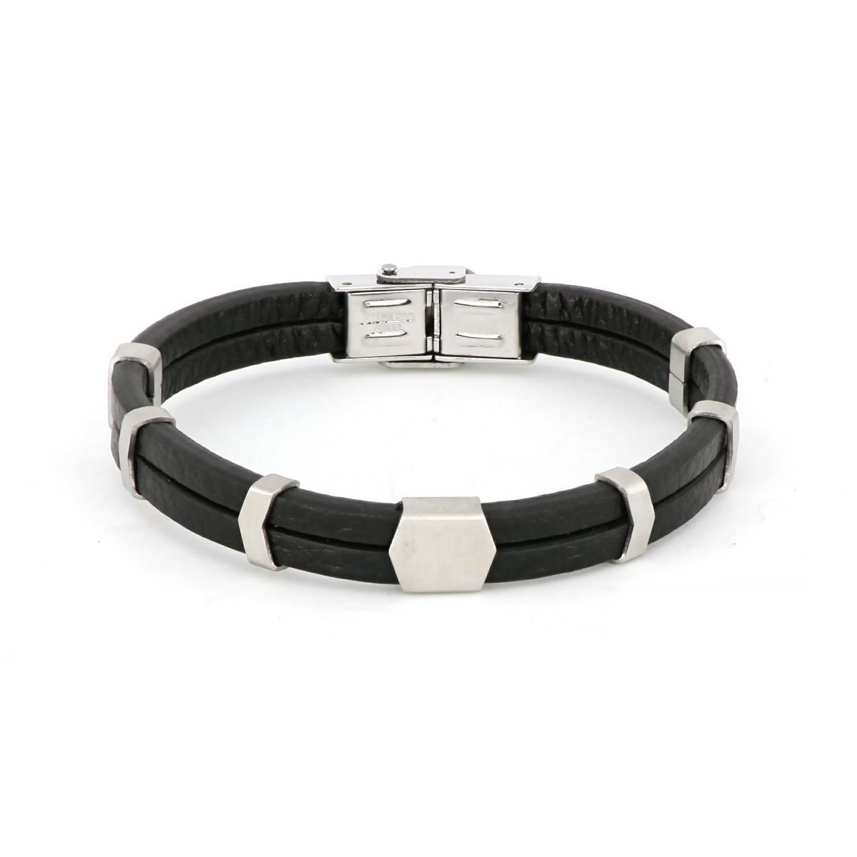 Ανδρικό βραχιόλι δερμάτινο μαύρο με ατσάλινα στοιχεία σε ασημί χρώμα
