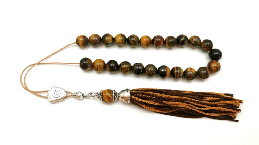 Κομπολόι από μάτι τίγρης,μέγεθος χάντρας 10mm,στολισμένο με μεταλλικά στοιχεία και φούντα από φυτικό μετάξι που δεν τσαλακώνεται και δεν ξεφτίζει