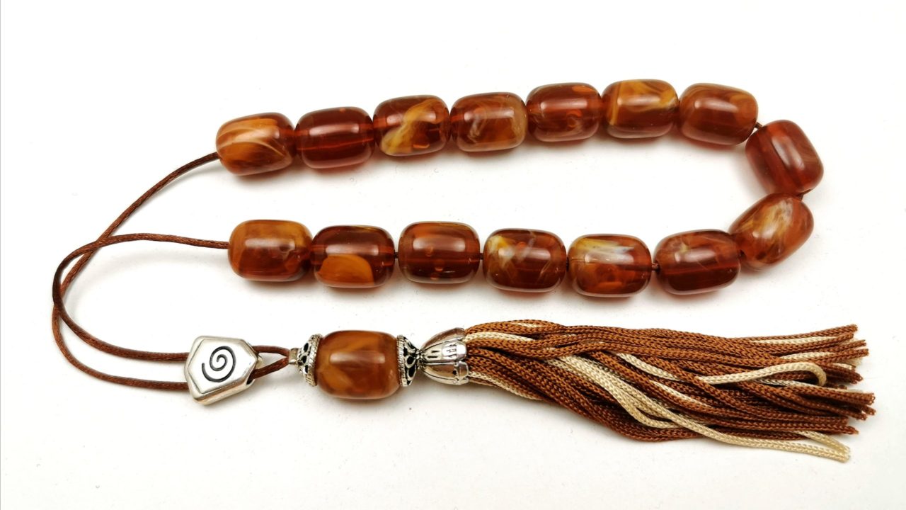 Κομπολόι από τεχνητή ρητίνη,μέγεθος χάντρας 12x16mm,στολισμένο με μεταλλικά στοιχεία και φούντα από φυτικό μετάξι που δεν τσαλακώνεται και δεν ξεφτίζει